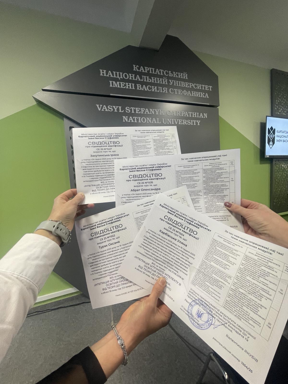 Викладачі кафедри взяли участь у курсах підвищення кваліфікації «Інтеграція штучного інтелекту в освітній процес: від теорії до практики», організованих Центром інноваційних освітніх технологій PNU EcoSystem. Навчання проходило в очному форматі з 4 по 15 грудня 2025 року.